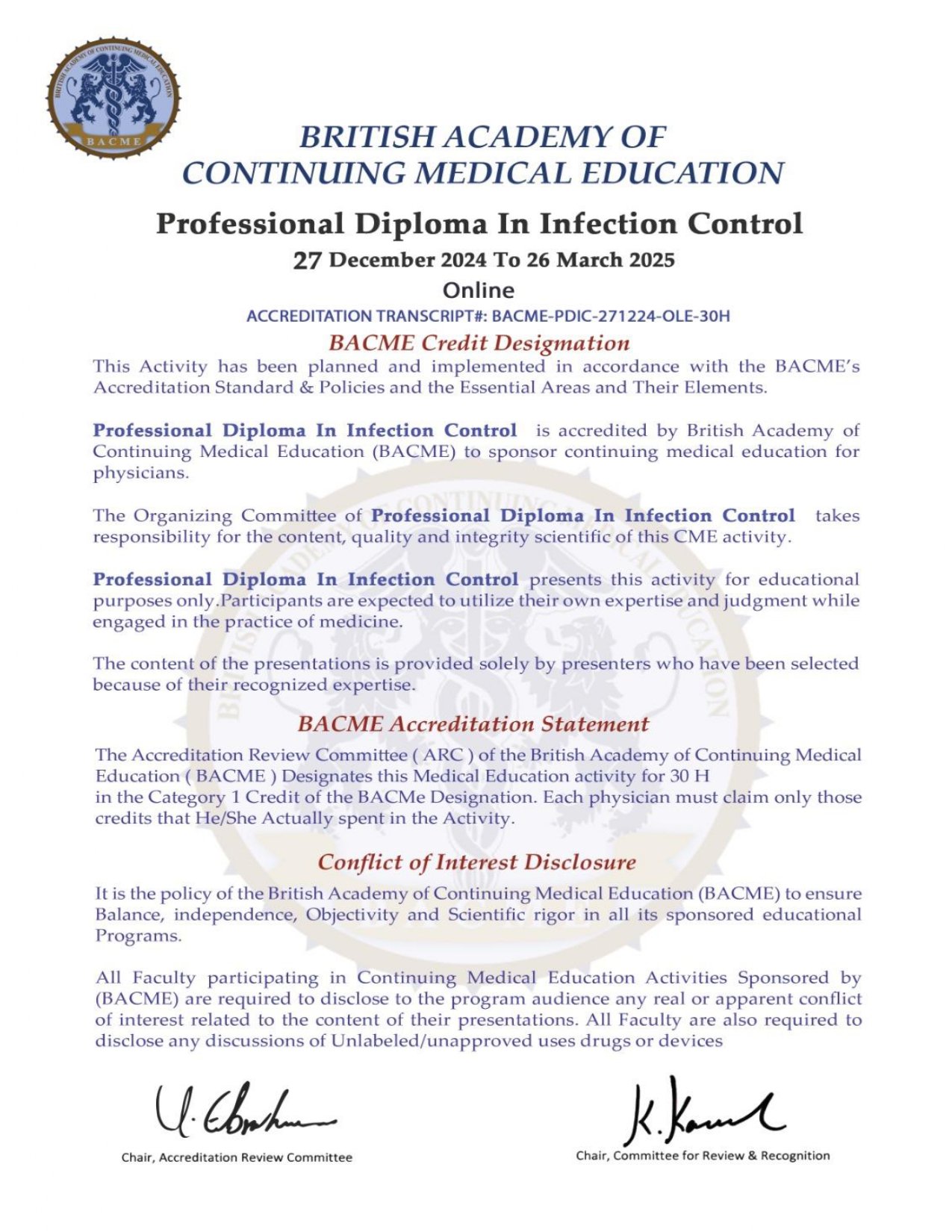2. يتيح هذا البرنامج الفرصة للمتدربين في الحصول على شهادة دبلوم مكافحة العدوى باعتماد الاكاديمية البريطانية بواقع 30 ساعة تدريبية. كما يقوم بتأهيلهم للعمل في وحدات التعقيم بالمستشفيات والمجمعات والعيادات والمراكز الصحية - الاعتماد BACME-PDIC-271224-OLE-30H